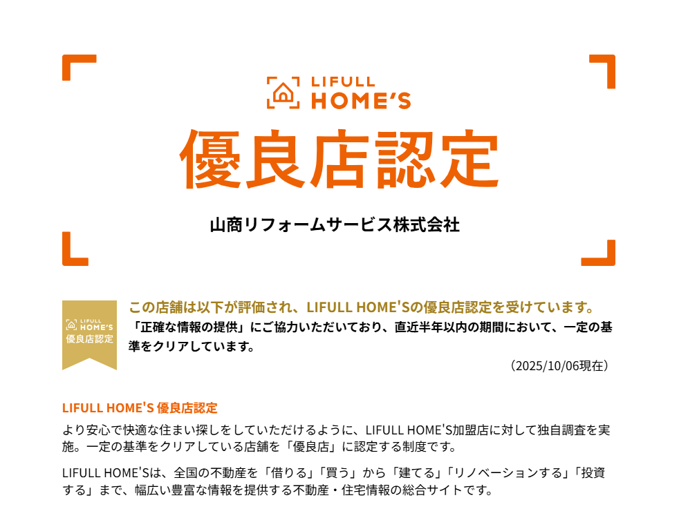 山商リフォームサービス株式会社はこの度、物件情報サイト「LIFULL HOME’S」様より