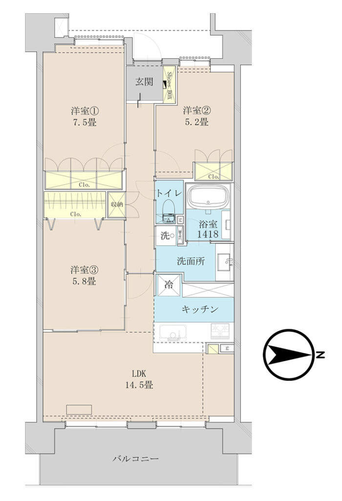 間取り:3LDK(洋室①7.5 洋室②5.2 洋室③5.8 LDK14.5)