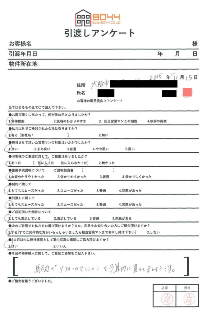 駅近でリフォーム&マンションを予算内に買えて満足です。