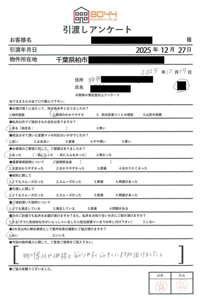 物件条件や価格を分かりやすく迅速に対応頂けました。
